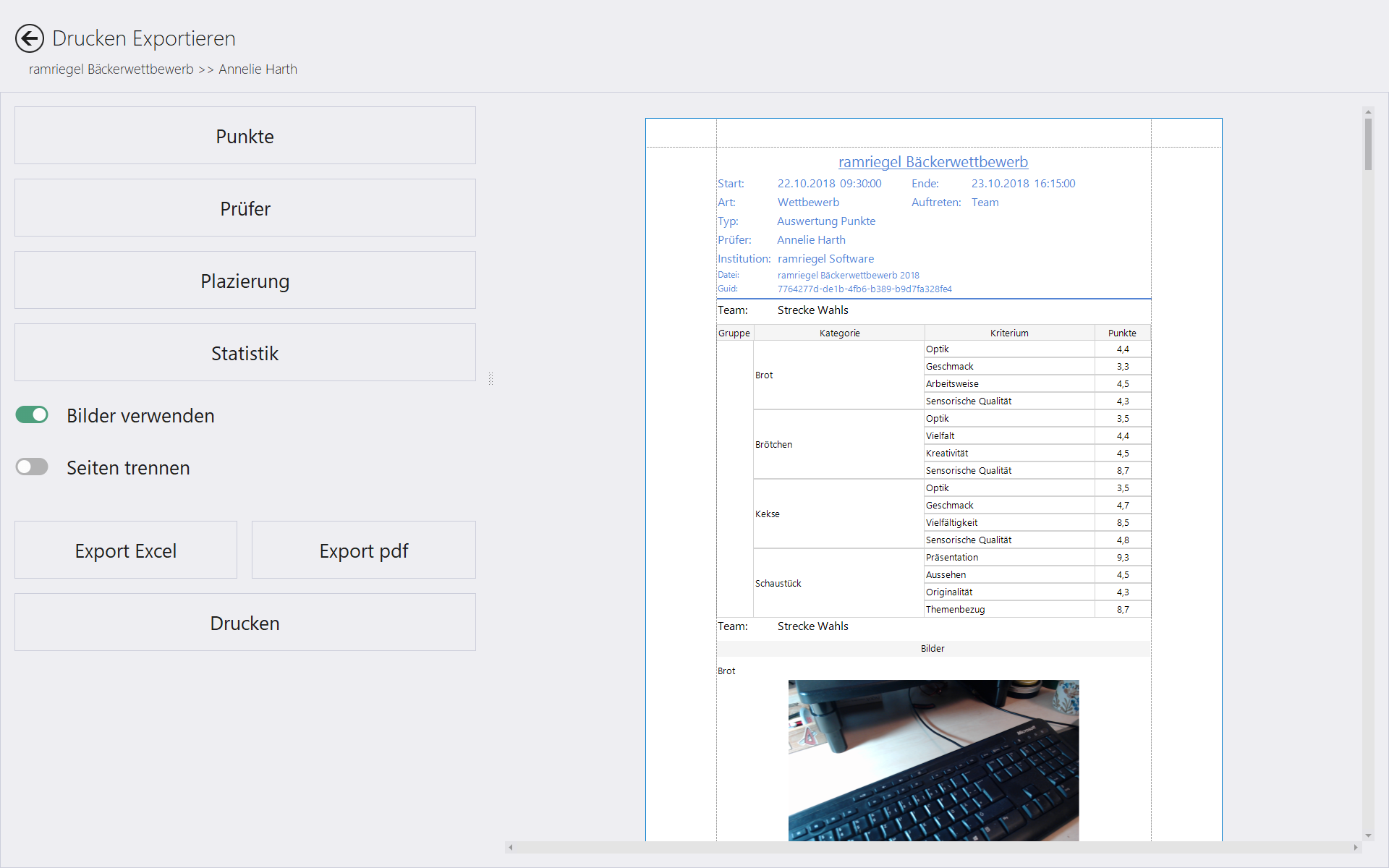 Übersicht über die bisher vergebenen Punkte für alle Püfer. Wird ein Tablet für alle Prüfer verwendet, oder die Daten von der Cloud geholt, werden auch alle anderen Prüferpunkte angezeigt.